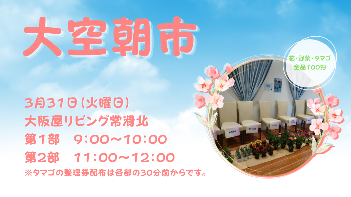 大阪屋リビング常滑北にて「大空朝市」を開催いたします。