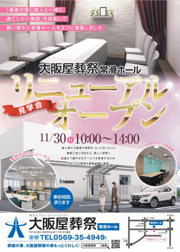 大阪屋葬祭の常滑ホールはリニューアルいたします!